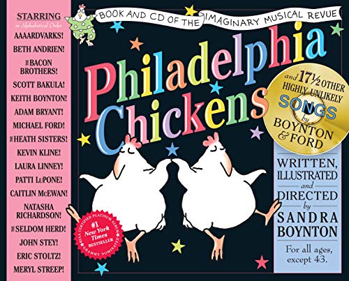 Sandra Boynton, long heralded for her menagerie of animal characters (Moo, Baa, La La La; Rhinoceros Tap), puts a fresh cast of singing, dancing critters center stage-from the titular boogying chickens to a tail-wagging “snuggle puppy”-in Philadelphia Chickens, a book-and-CD package billed as an “imaginary musical revue.” The first 32 pages contain lyrics and illustrations, the second half of the book includes musical notation and additional lyrics for each song. An all-star cast, including Meryl Streep, Laura Linney, Eric Stoltz and the Bacon Brothers, headlines the musical recording, which features a variety of original show tunes penned by Boynton and composed by Boynton and frequent collaborator Michael Ford.